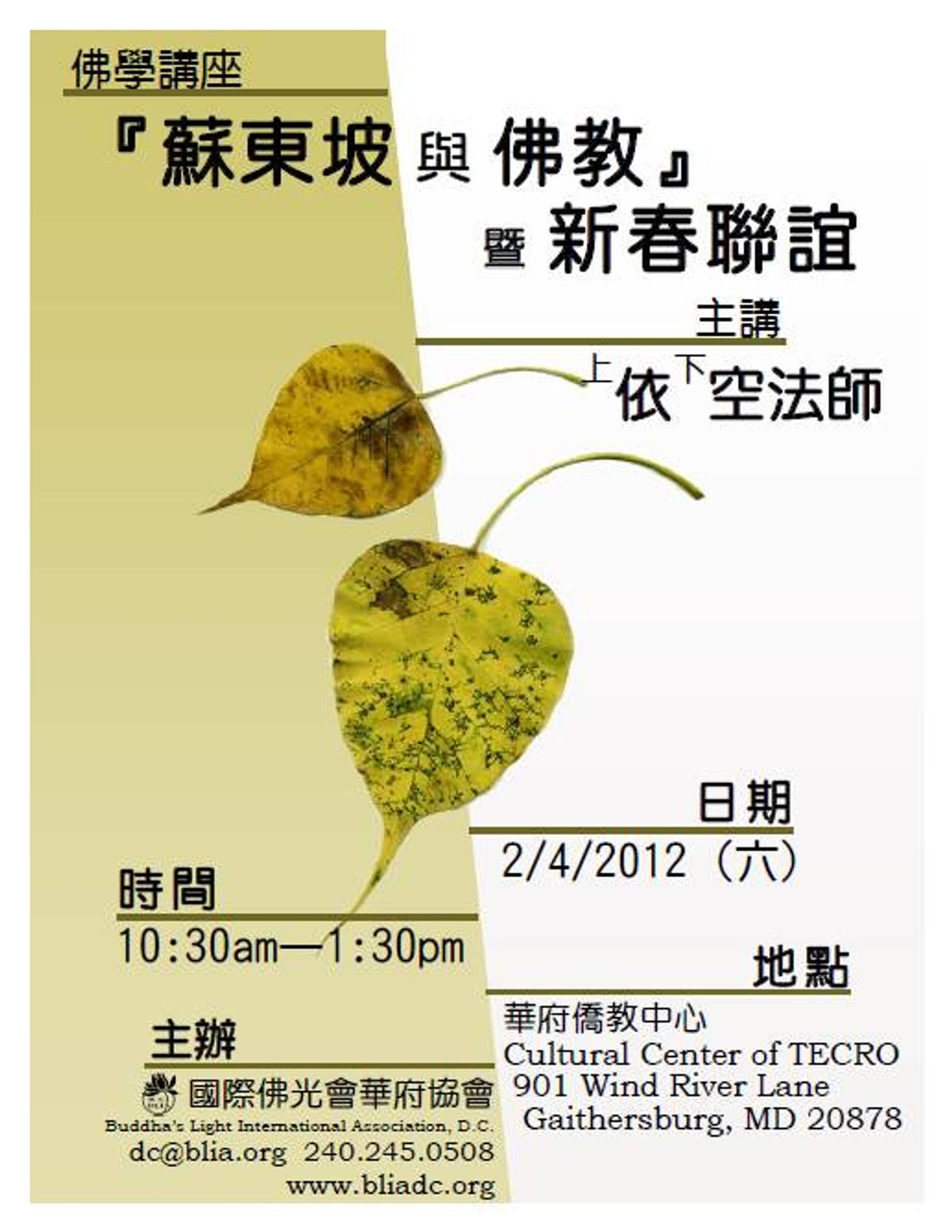 國際佛光會華府協會於二月十九日假僑教中心舉辦新春聯誼及佛法講座活動。節目由北卡佛光山寺如德法師輕鬆的唱遊展開。然後由會長王立旻師姐簡介佛光山(IBPS),國際佛光會(BLIA)及華府協會(BLIA DC)。佛光山在開山宗長星雲大師的領導下宣揚人間佛教,樹立「 以文化弘揚佛法、以教育培養人才、以慈善福利社會、以共修淨化人心」的四大宗旨,以及「給人信心、給人歡喜、給人希望、給人方便」的四大信條。