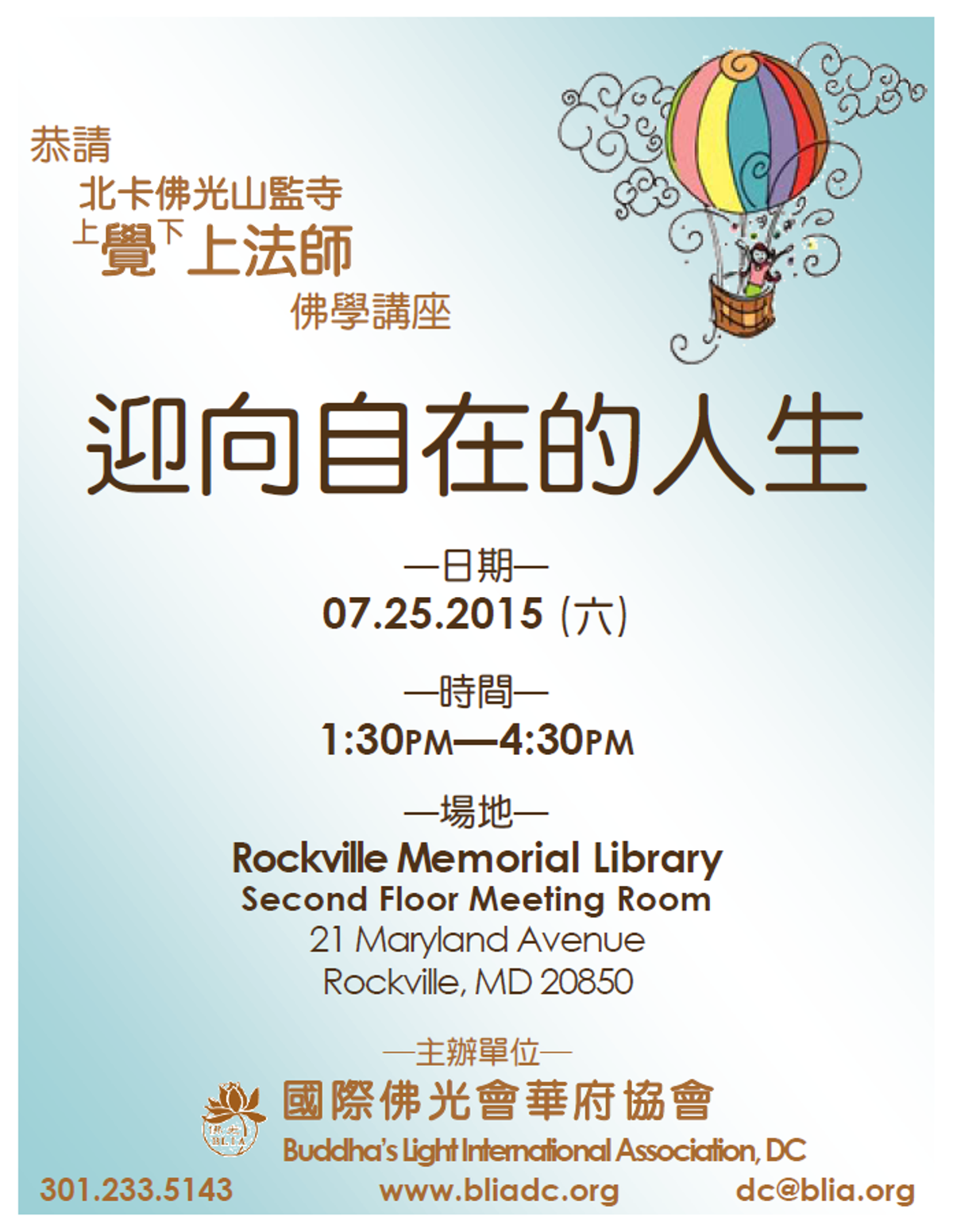 國際佛光會華府協會於2015年7月25日在洛城圖書館,舉辦了一場三小時的佛學講座,特別邀請到北卡道場當家師父覺上法師,為大家主講如何"迎向自在的人生"。