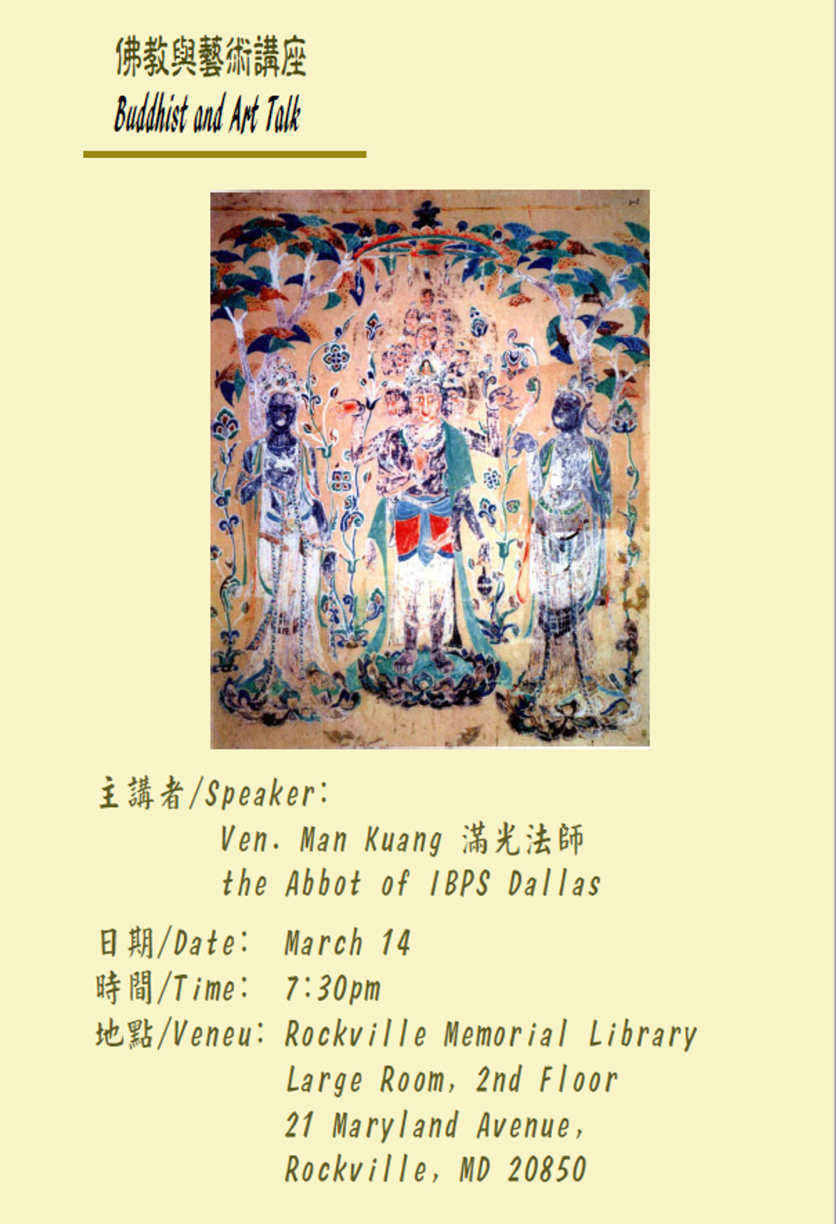 國際佛光會華府協會於3月14日晚上七時半假洛城圖書館,禮請到達拉斯道場住持滿光法師, 為大家主講「佛教與藝術」。近五十位信眾,滿懷欣喜的聆聽法師生動的演講。
