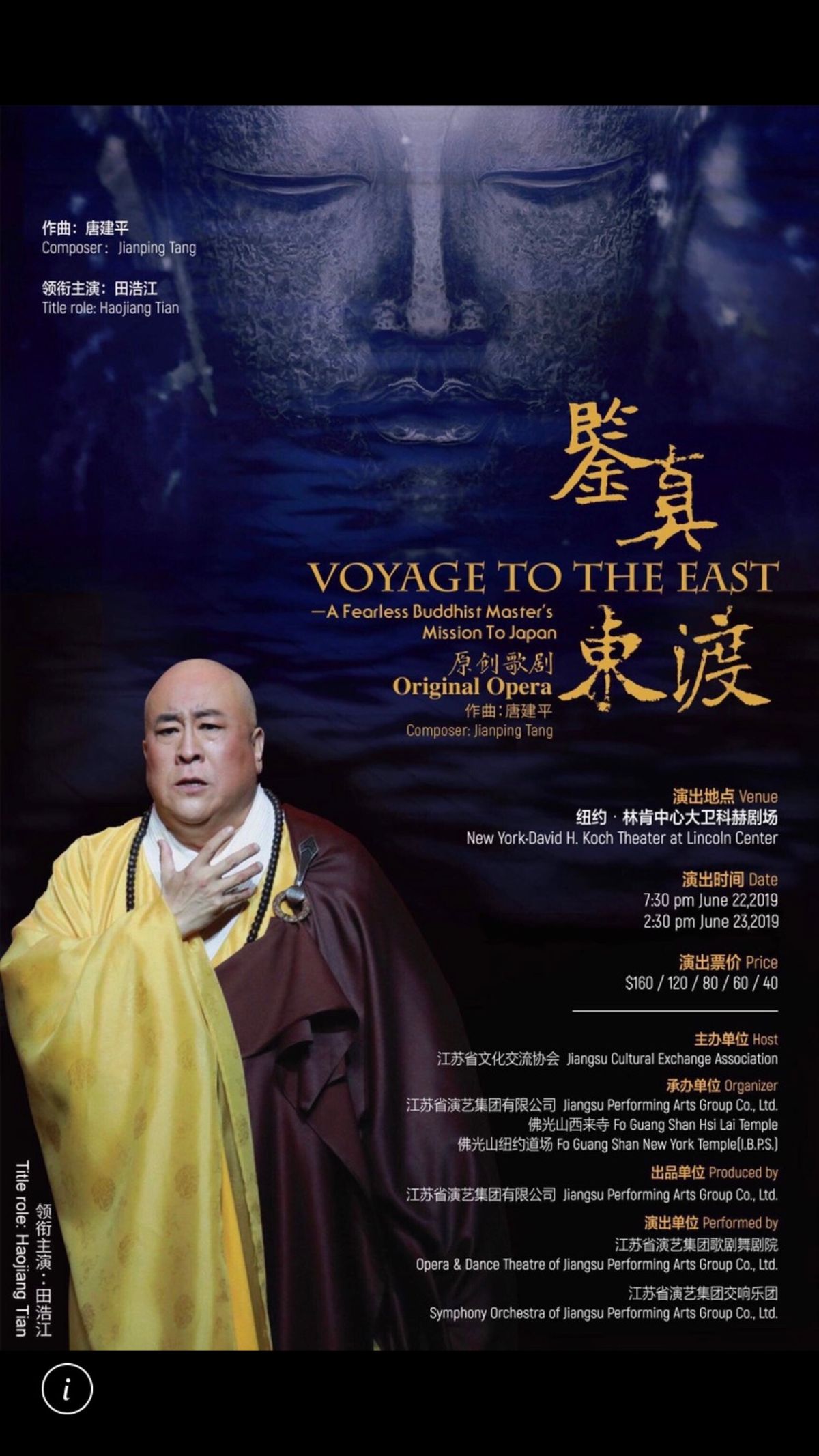這齣原創歌劇的高水準中文演唱,加上史實的感人,再搭配佛法意境的場景佈置, 比較起以往所看的歌劇,她使我更有聽覺與視覺上的共鳴享受。鑑真大師的慈悲風範、 毅力決心,在歴經十年艱險困厄之後終於完成他的理想,是這份初心的堅持, 給了我們後人努力的典範。